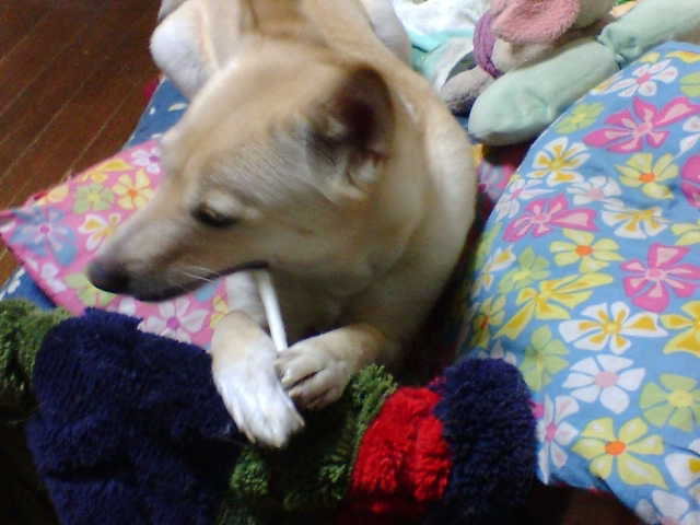 ミルク棒をかじってます前足で押さえてるのがカワイイ~