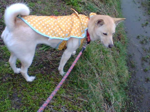 カッパを着て散歩です ジーと見てるのは鳩さん達です