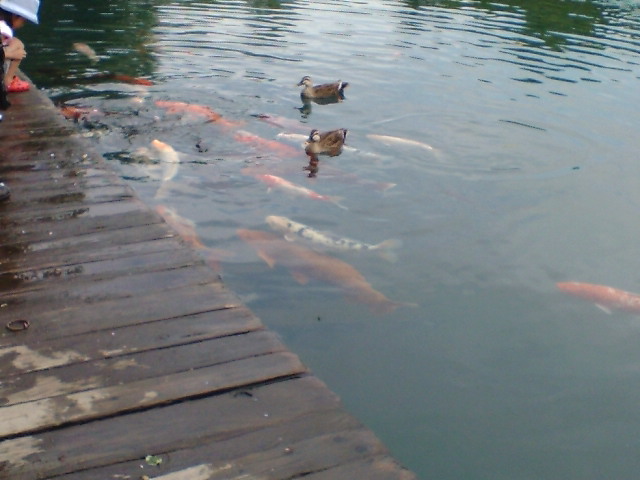 でっかい鯉と 鴨がいました