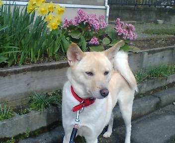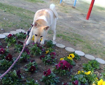 ちゃんの視線の先は、ワンちゃん。「花よりワンちゃん」ですね。