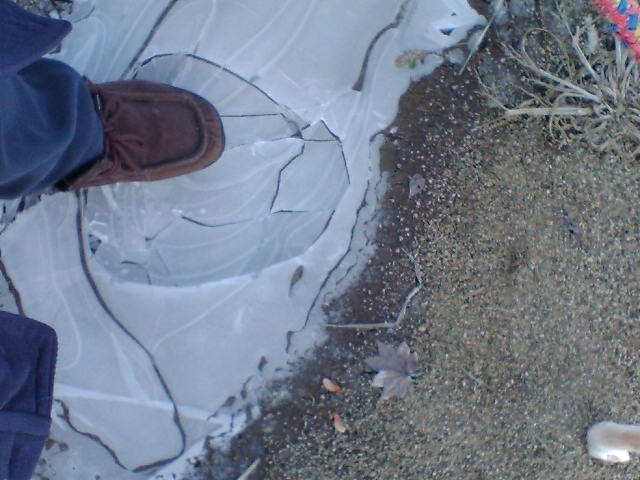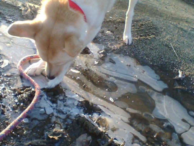 暖冬とはいえ、まだ2月。だいぶ冷え込んだので、水たまりが凍ったかな~と