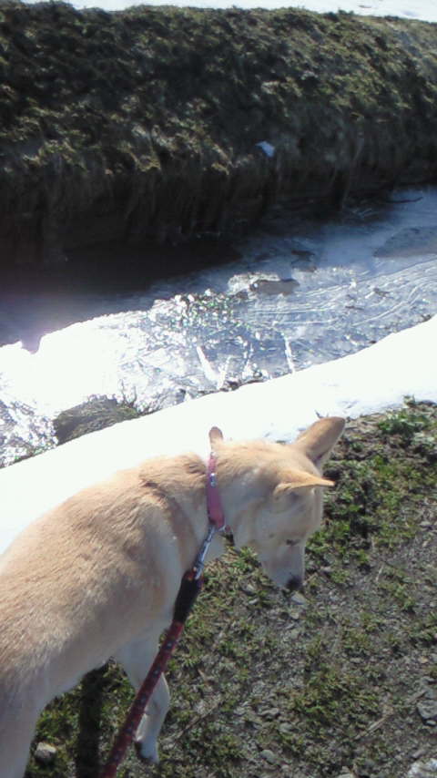 田んぼの小川が凍って、キラキラしてます。